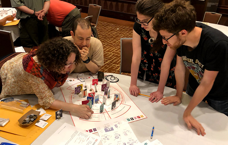 Because the game all takes place on a 20" x 30" poster, teams can easily work together to solve the puzzles.